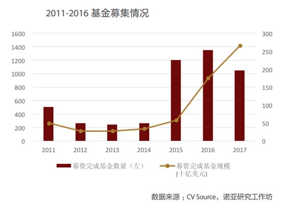 2017年共有1049只私募股权基金完成募集,募集规模达2660.42亿美元,虽然基金数量较2016年有所下降,但是募集规模却大幅上升,募资完成基金平均规模达到新高。