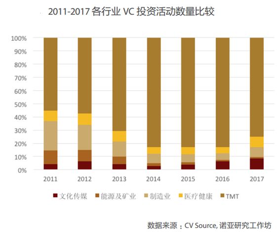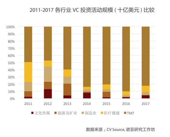 VC投资方面,无论是从投资数量还是投资规模上看,TMT依然独领风骚。能源及矿业投资仍然逐步走低,文化传媒、制造业和医疗健康行业投资稳步提升。