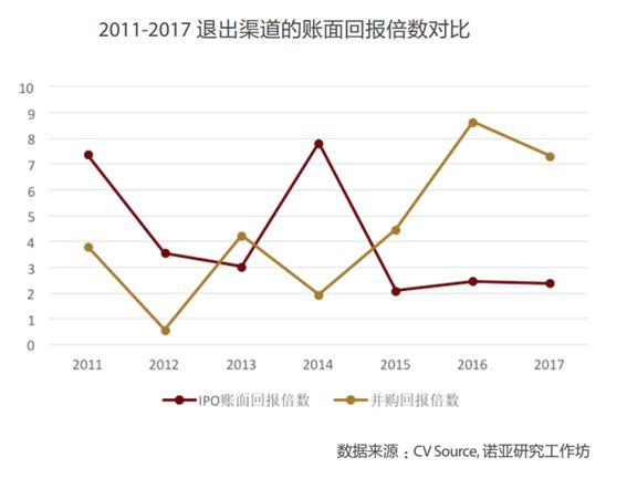 投资回报倍数:2011-2017年间并购退出的回报水平经常高于IPO退出,尤其是近些年并购退出的回报更是连续高于IPO退出的回报,这其中一定程度受到了2013和2015年IPO停发的影响,也有IPO发行估值水平限制,以及市场行情波动的因素。2017年并购退出的回报倍数虽然较2016年8.61的高值有所回落,但是仍然录得了7.29的高回报水平。随着政策扶持优质企业上市,未来并购退出是否会重新超越IPO退出值得后续密切关注。