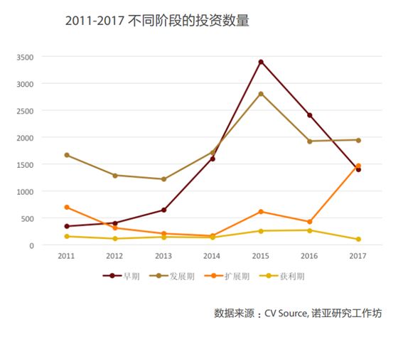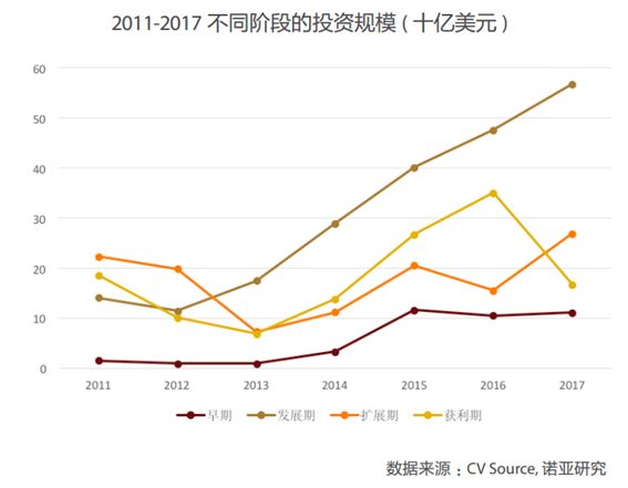 歌斐从数量和规模两个角度出发,将全市场基金投资项目按照“早期、发展期、扩展期和获利期”四个阶段进行了划分,可以发现早期的投资数量在2017年有所下降,投资早期化的趋势有所减弱,而扩展期增长明显,发展期则保持相对稳定,投资活跃度依然最高。从投资规模上来看,发展期投资依然是投资的集中区。