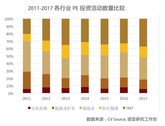 PE投资方面,从投资数量和投资规模来看,TMT和制造业依然是投资最为聚焦的两大领域。而医疗健康则成为了2017年投资增长最为显著的行业,成为又一个投资热门领域。而在投资规模方面,TMT依然独占鳌头,制造业紧随其后,能源行业也依然保有较大的投资规模,位列第三,医疗健康虽然投资数量增长最为显著,但是总体规模增长有限。