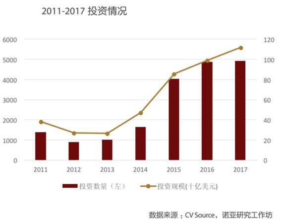 投资环节,2017年的投资数量和投资规模均创新高,连续五年增长。